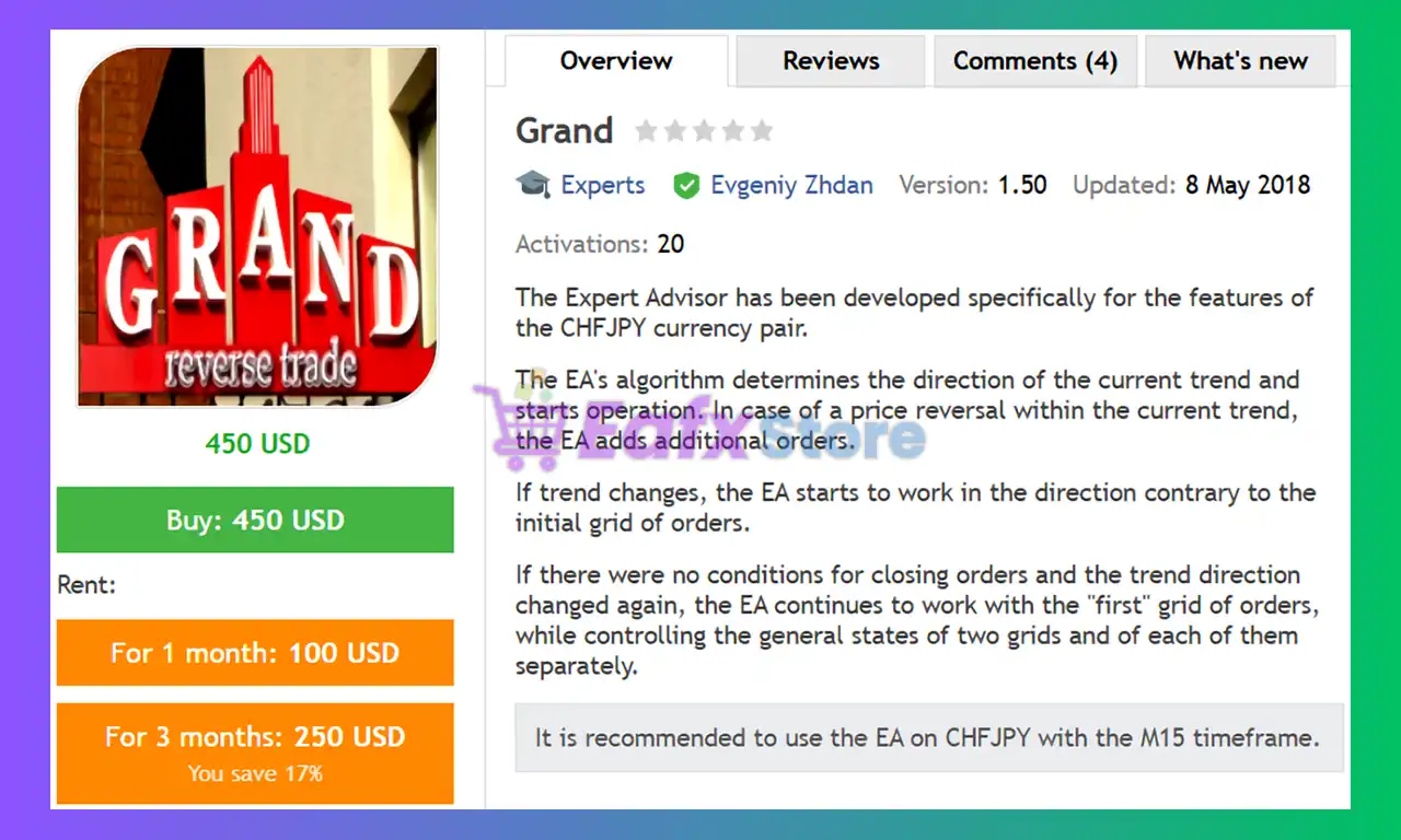 Grand EA is developed for MetaTrader 4 (MT4) and works best on the M15 (15-minute) timeframe, providing an ideal balance between grid responsiveness and trend confirmation accuracy.