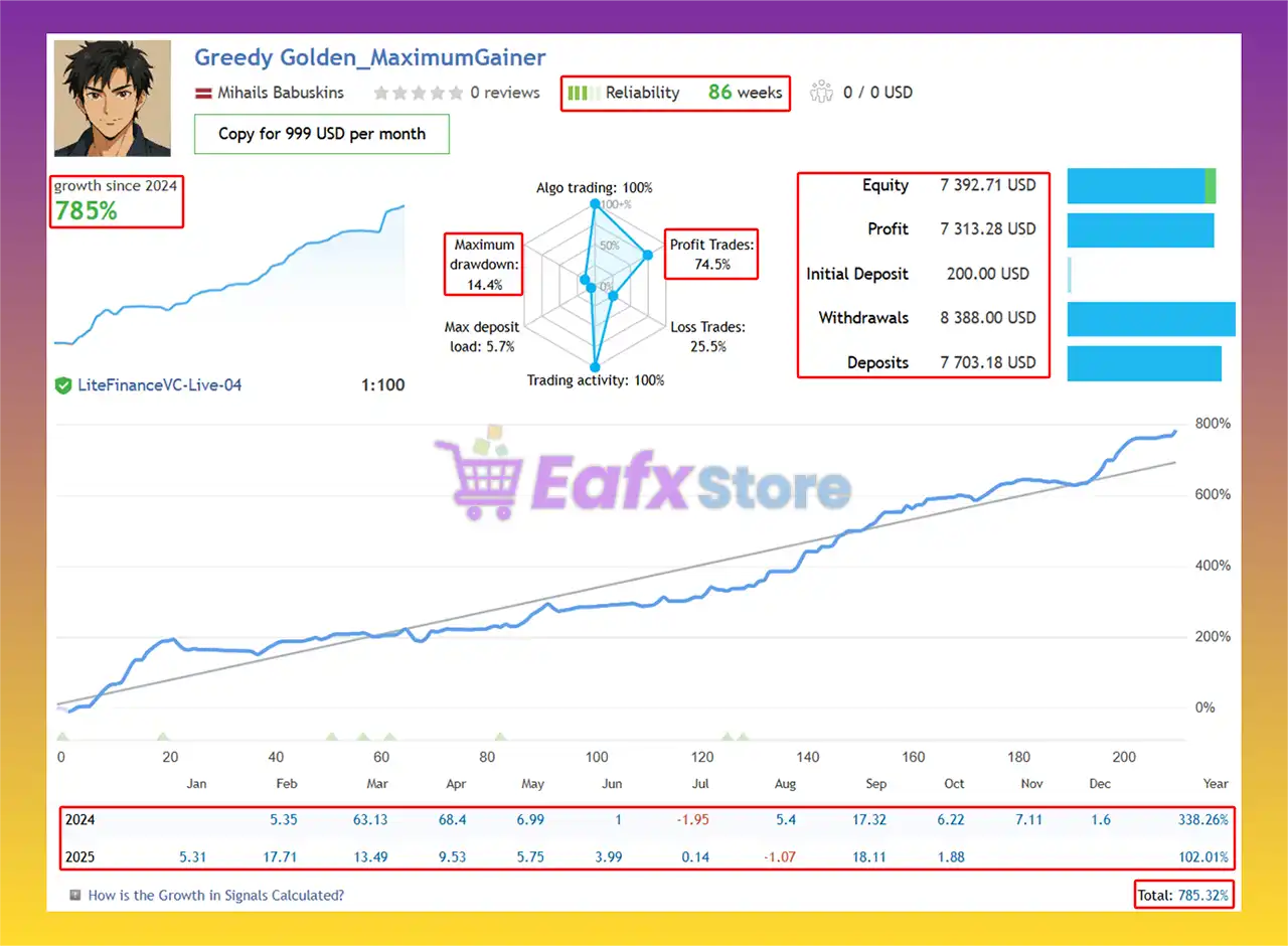 Greedy Golden EA’s trading performance for 86 consecutive weeks shows impressive parameters and excellent safety.