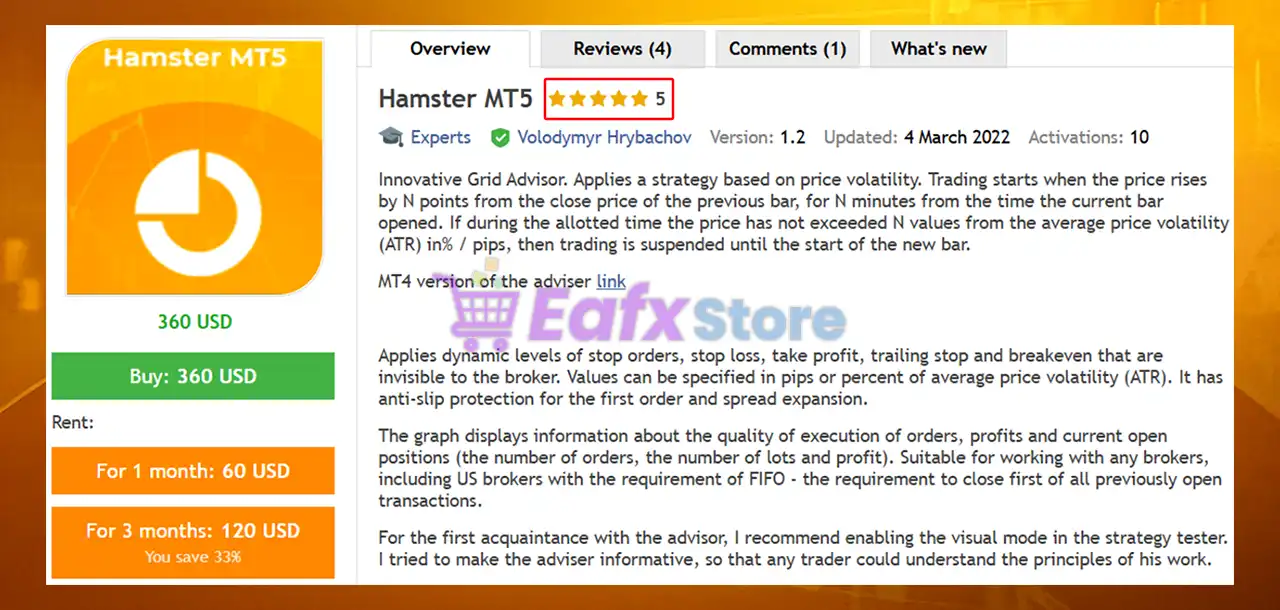 This product is compiled by Volodymyr Hrybachov. This author has more than +11 years of experience working on MQL5 with many famous products such as Hamster MT5, Octopus MT5, Kraken MT4, Universal MT5 and other advisors. Among them, Hamster MT5 is his best performing product.