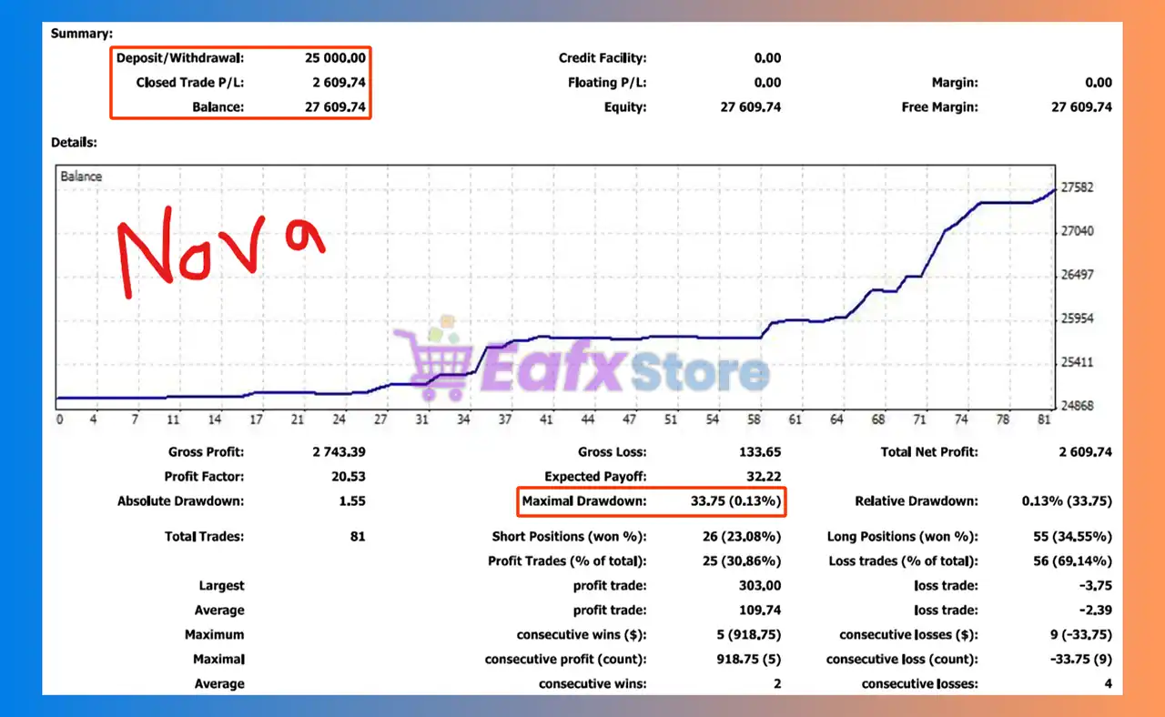The EA can run on any leverage and requires a minimum deposit of $100, though it is typically used on challenge accounts with balances from $25,000 to $27,000 or higher.