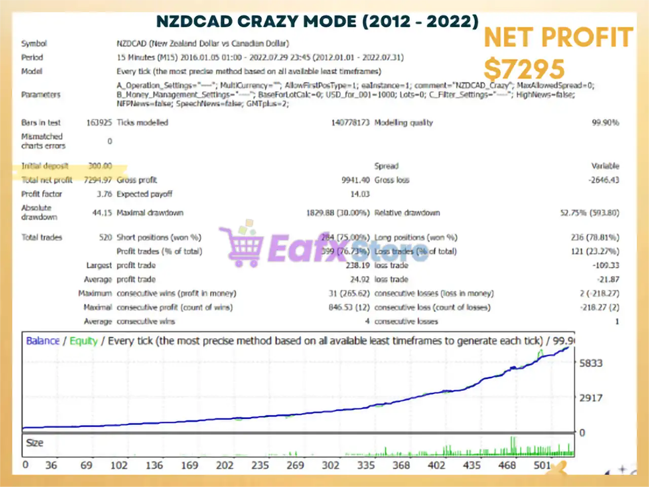 🔶 The Hundred Egg EA backtest trading results achieved impressive profit performance for 10 years on the NZDCAD pair.