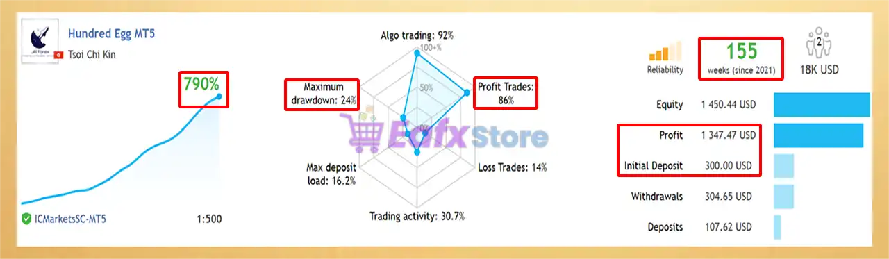 This product is compiled by Tsoi Chi Kin. This author has more than +3 years of experience working on MQL5 with many famous products such as Hundred Egg EA MT5, Hundred Egg EA MT4, EuroNest Egg MT4, Gilded Egg EA MT4 and others. Among them, Hundred Egg EA is his best performing products.