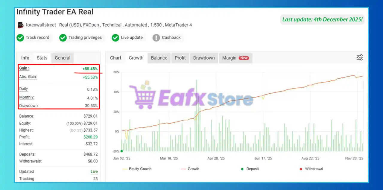 ❓ What level of performance has Infinity Trader EA demonstrated in real accounts?