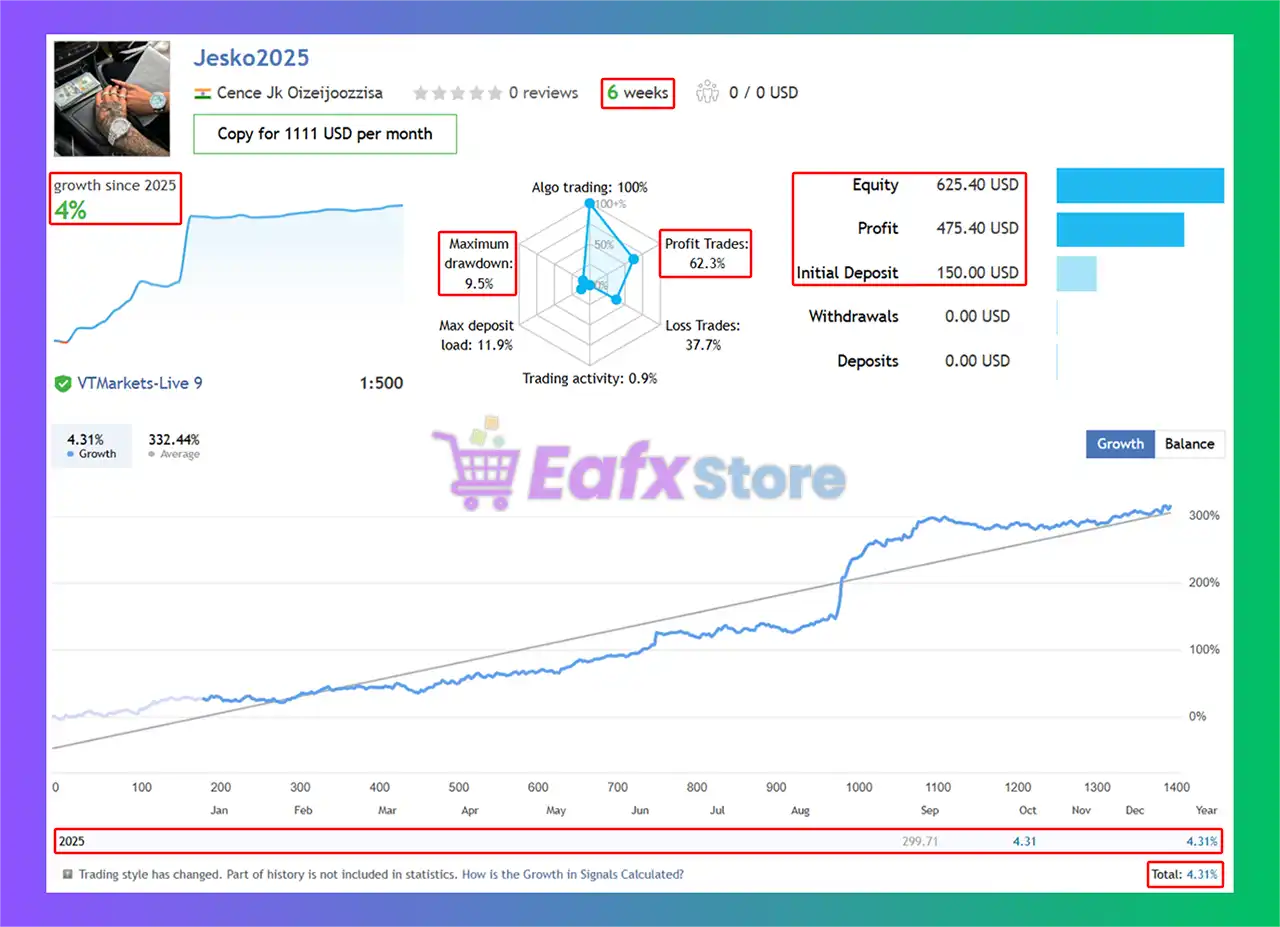 🔹Jesko’s live trading results over 6 weeks have been impressive and consistent. The EA uses 1:500 leverage, providing reliable growth.