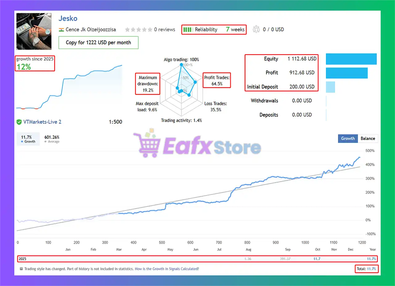 🔹Jesko’s live trading results over 7 weeks have been impressive and consistent. The EA uses 1:500 leverage, providing reliable growth.