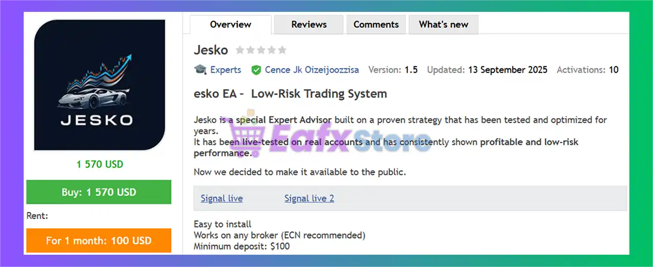 Jesko EA is a specialized Expert Advisor (EA) built on a proven strategy optimized for years and consistently tested on real accounts for low-risk performance. It is primarily designed for Gold trading on the M1 or M timeframes, offering easy installation, flexible risk modes, and professional risk controls like a Max Spread filter.