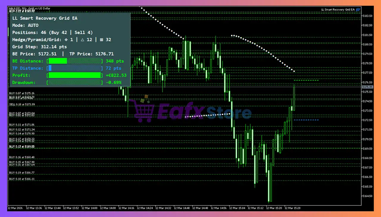 LL Smart Recovery Grid EA MT5 is optimized for XAUUSD, adapting to gold volatility using ATR-based grid spacing and dynamic trade logic.