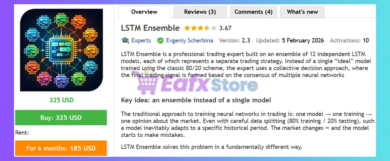 This product is compiled by Evgeniy Scherbina. This author has more than +12 years of experience working on MQL5 with many famous products such as LSTM Ensemble EA MT5, Edge Ensemble EA MT5, LuminaFX MT5, QuantumPip MT5 and others. Among them, LSTM Ensemble EA is his best performing product.