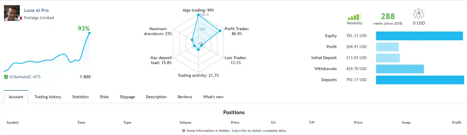 The Luna AI PRO achieved impressive profit performance when trading with FX pairs. Trading results on real account for 288 consecutive weeks of trading: