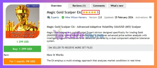 In short, Magic Gold Scalper EA stands out as a gold-optimized trading EA for MetaTrader 5, integrating weighted technical confluence and multi-timeframe analysis. Its adaptive Stop Loss and Take Profit, session filters, and flexible lot sizing help control risk in volatile markets. Built for consistency and precision, Magic Gold Scalper EA offers reliable automated XAUUSD trading results.