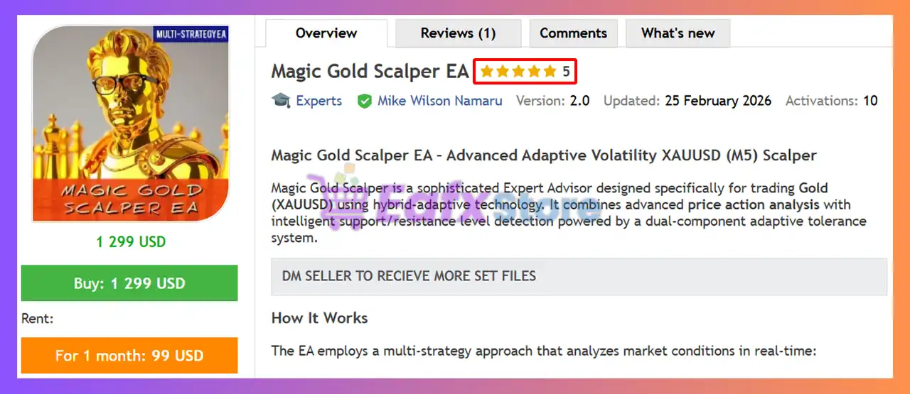 This product is compiled by Mike Wilson Namaru. This author has more than +1 years of experience working on MQL5 with many famous products such as Magic Gold Scalper EA MT5, Quantum Sniper EA MT5, Price Action Scalper MT5, SMC Sniper MT5 and others. Among them, Magic Gold Scalper EA is his best performing products.
