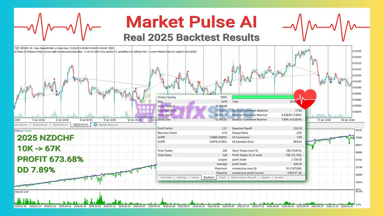 Market Pulse AI is an automated trading robot with NZDCHF, EURCHF, AUDCAD, GBPCHF, AUDCHF, NZDCAD. Real performance has been tested on a real account.