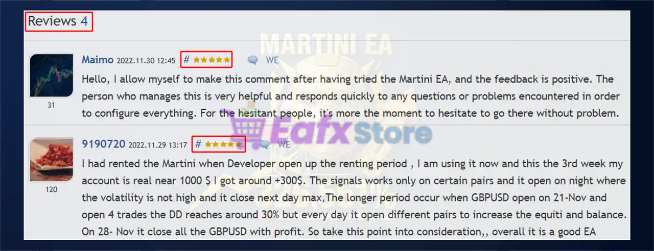 ➡️ Mr.9190720 (2022.11.29): “I had rented the Martini when Developer open up the renting period , I am using it now and this the 3rd week my account is real near 1000 $ I got around +300$. So take this point into consideration,, overall it is a good EA.”