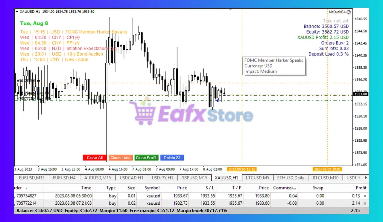 McDuckEA is specifically optimized for XAUUSD (Gold) and performs effectively on any timeframe. However, many users prefer M5 or M15 for smoother grid behavior and safer entries.