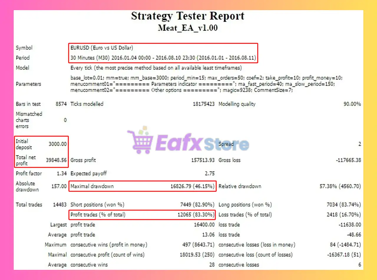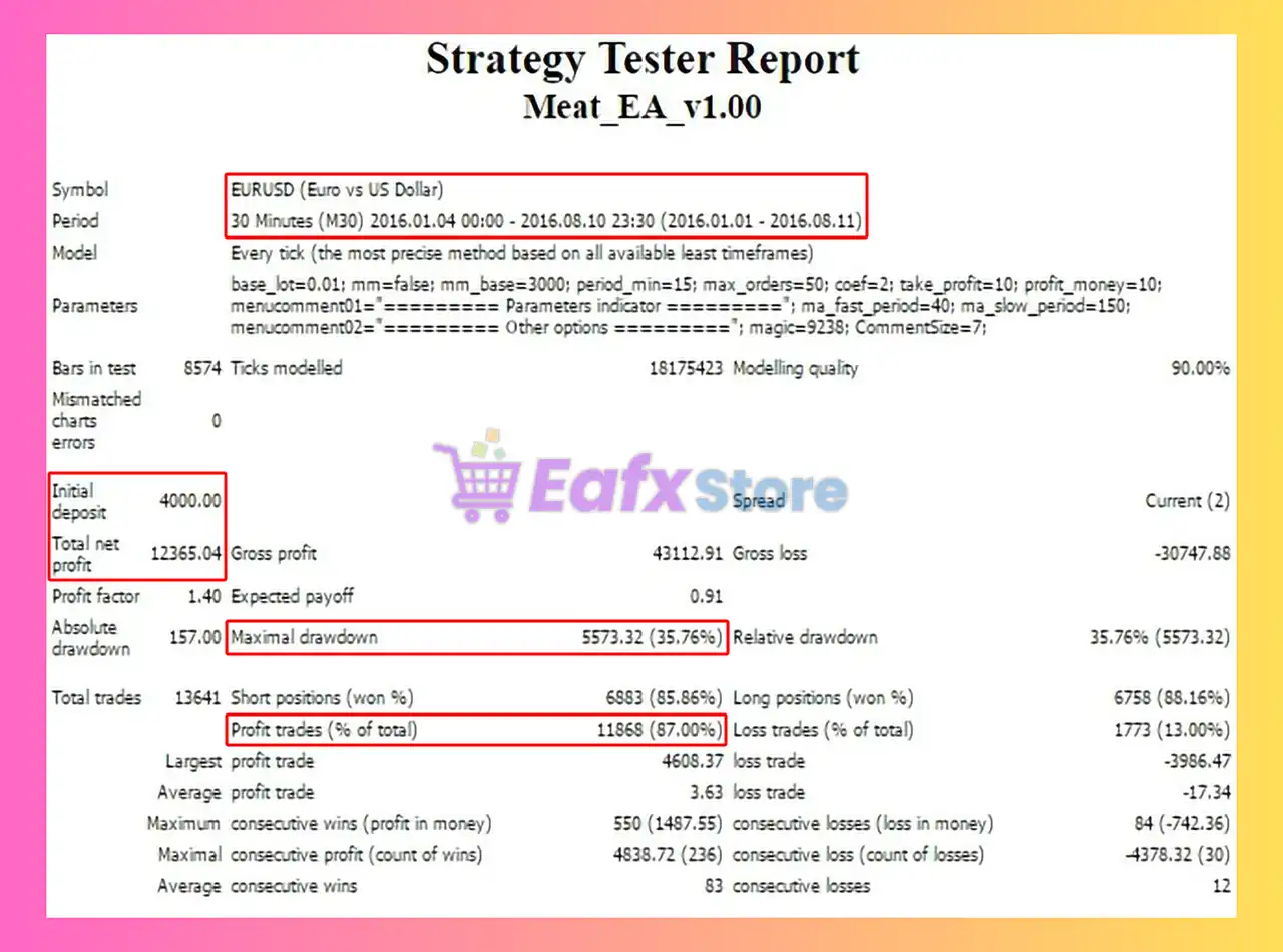 ✅ Meat EA MT4 is a fully automated 24/7 trading system designed for EURUSD on the M30 timeframe. It uses built-in market movement indicators and Moving Average trend filters to identify precise, trend-aligned entry points without manual intervention.