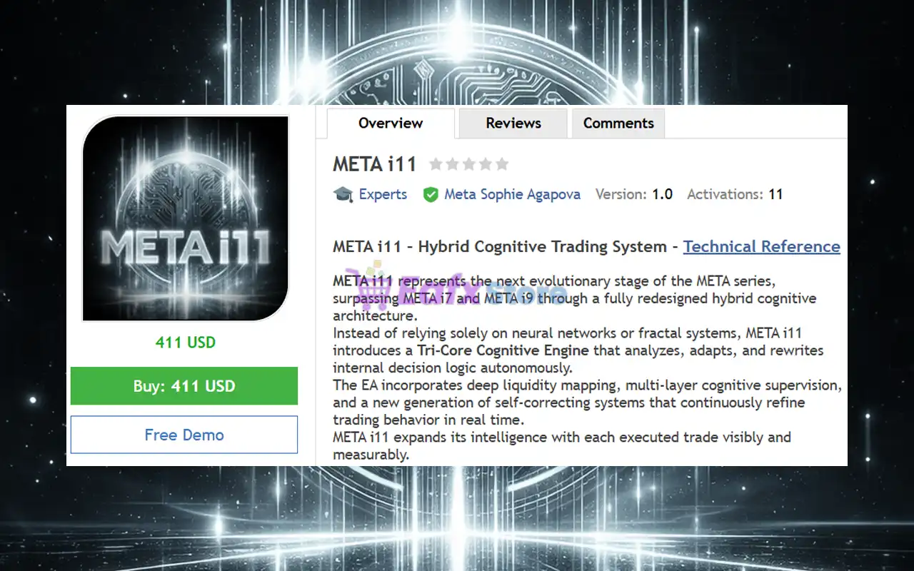META i11 is powered by a Tri-Core Cognitive Engine and Neural Error Immunity System, allowing it to self-upgrade its trading logic by learning from market liquidity shifts and past trade outcomes.
