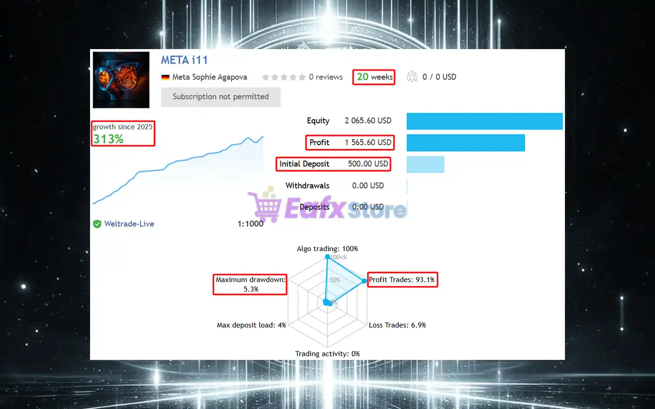 The META i11 EA has demonstrated extraordinary trading performance on a verified Myfxbook account. Below is a breakdown of the key metrics and what they reveal about the Expert Advisor (EA):