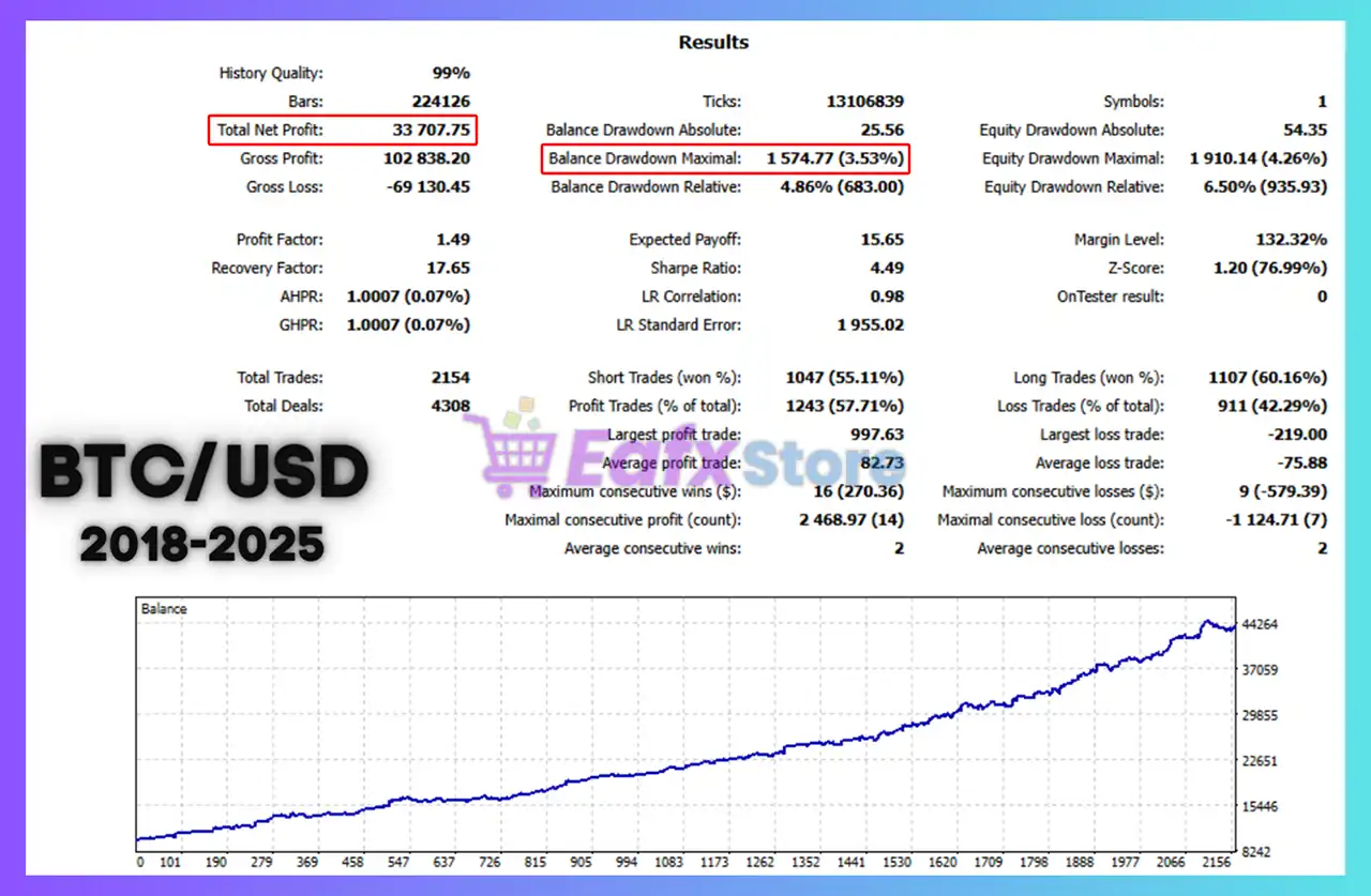 🔶 The Musahi EA backtest trading results achieved impressive profit performance for 7 years (2018 – 2025) on the BTC/USD pair.