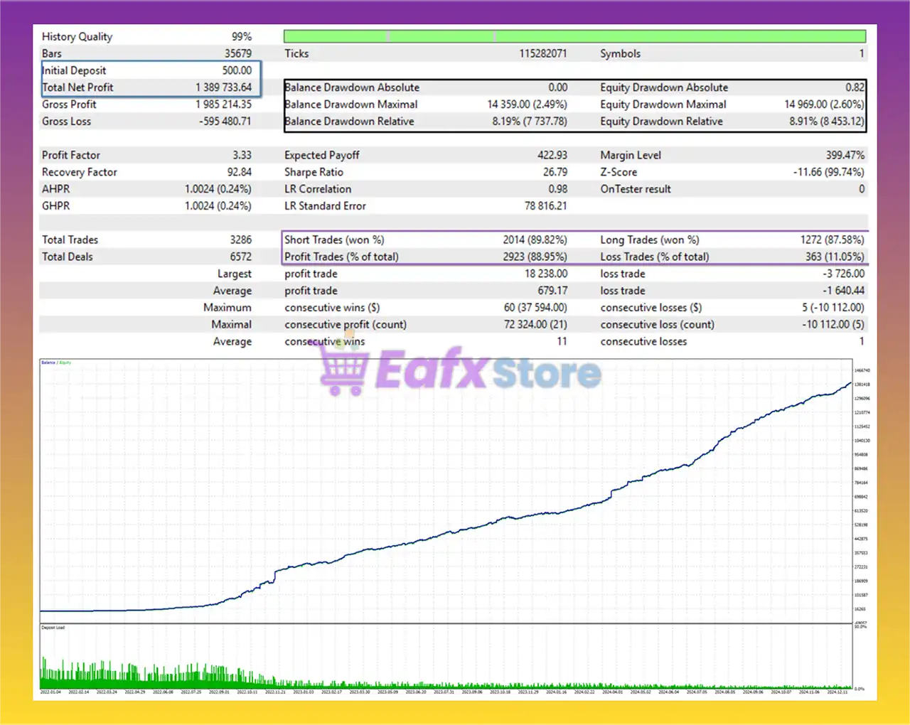 In live trading, the EA reached +116% profit in 6 weeks with only 12.4% drawdown. In a 3-year backtest, it achieved $1.39 million profit from a $500 initial deposit with an 88.95% win rate and just 2.49% drawdown.