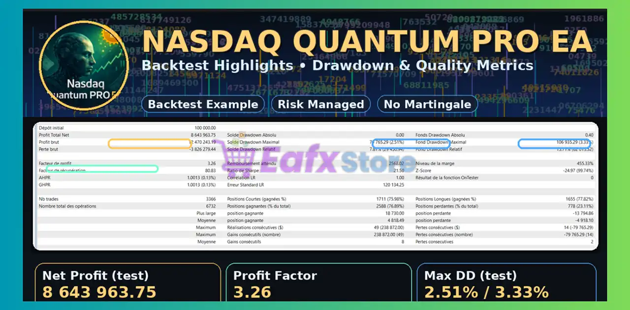 Nasdaq Quantum PRO EA includes dynamic lot sizing, drawdown safeguards, and exposure caps.