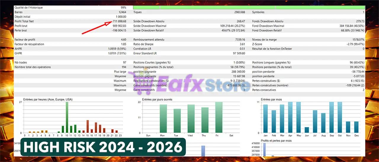 The results of the reverse test trades on NeuroBreak Twin Runner EA system achieved impressive profit performance over 2 years with the HIGH RISK strategy.