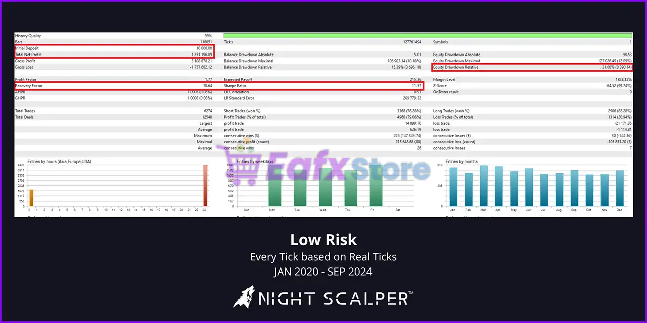 🧩 The results of the Night Scalper by NoCap FX show impressive profit performance over approximately 4 years. The performance achieved when using the Low Risk strategy is as follows: