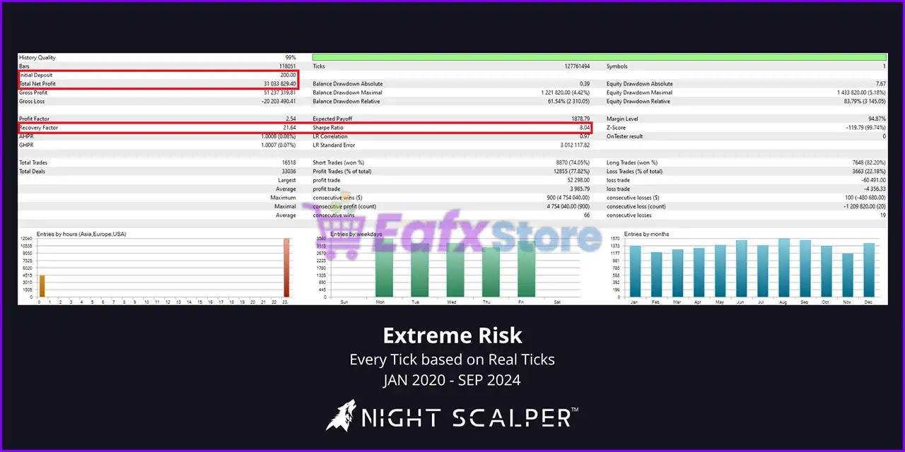 🧩 The results of the Night Scalper by NoCap FX show impressive profit performance over approximately 4 years. The performance achieved when using the Extreme Risk strategy is as follows: