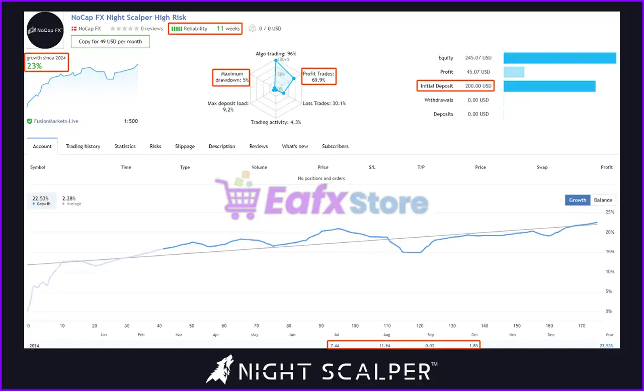 The minimum recommended deposit is $100, making Night Scalper by NoCap FX accessible for conservative traders and small accounts.