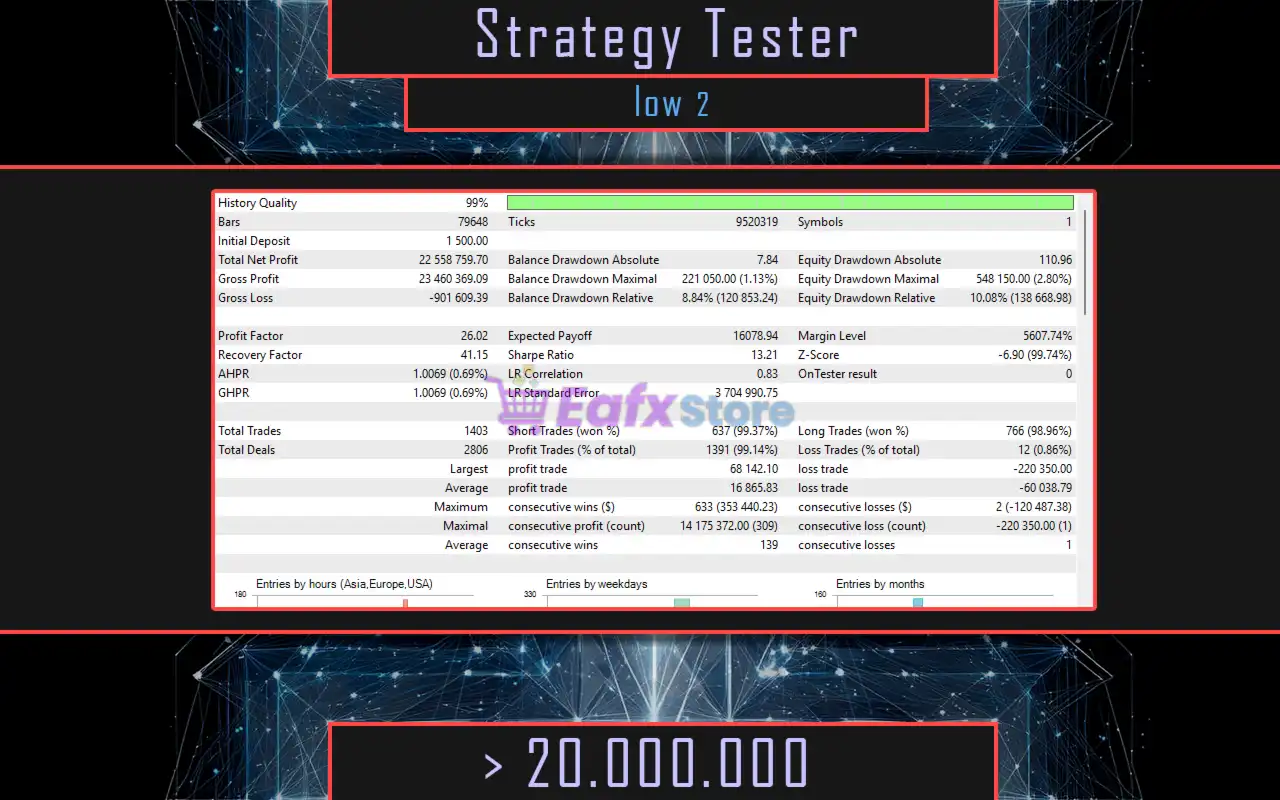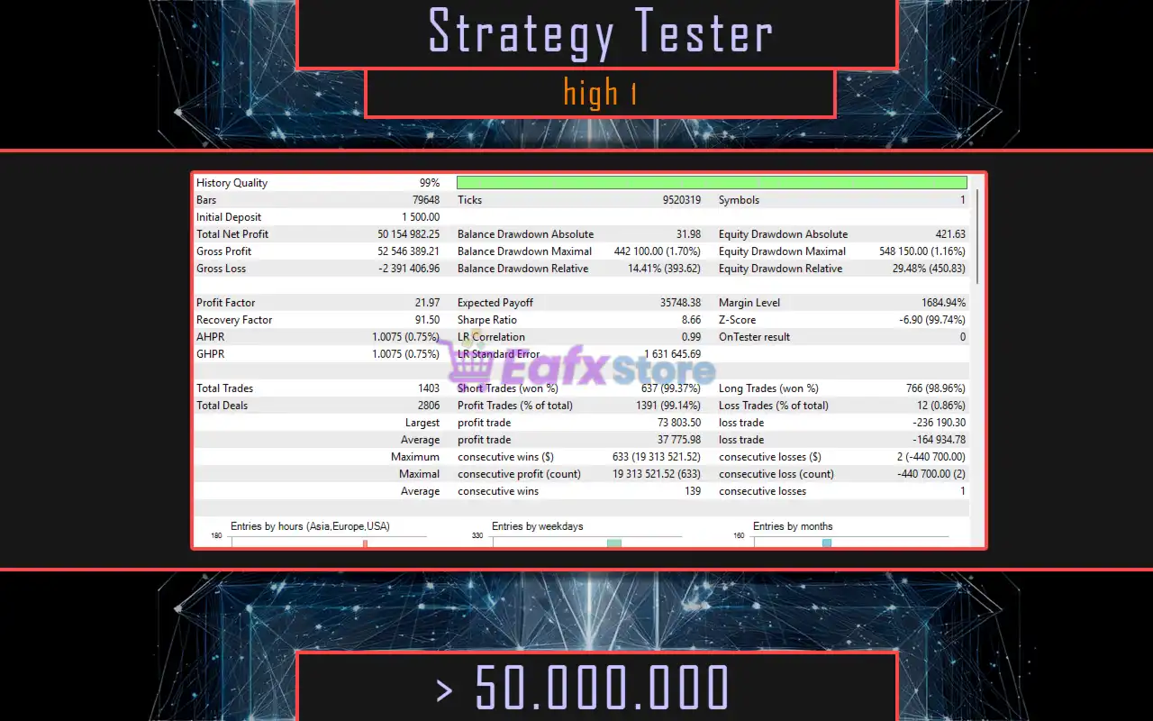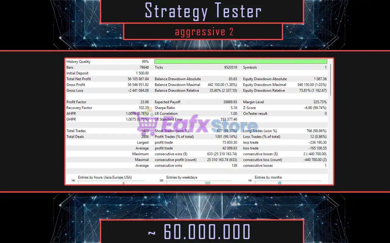 Backtests showed up to $56.11 million profit from a $1,500 deposit, with a 99.14% win rate and drawdown between 1.13%–1.70%, depending on the risk profile.