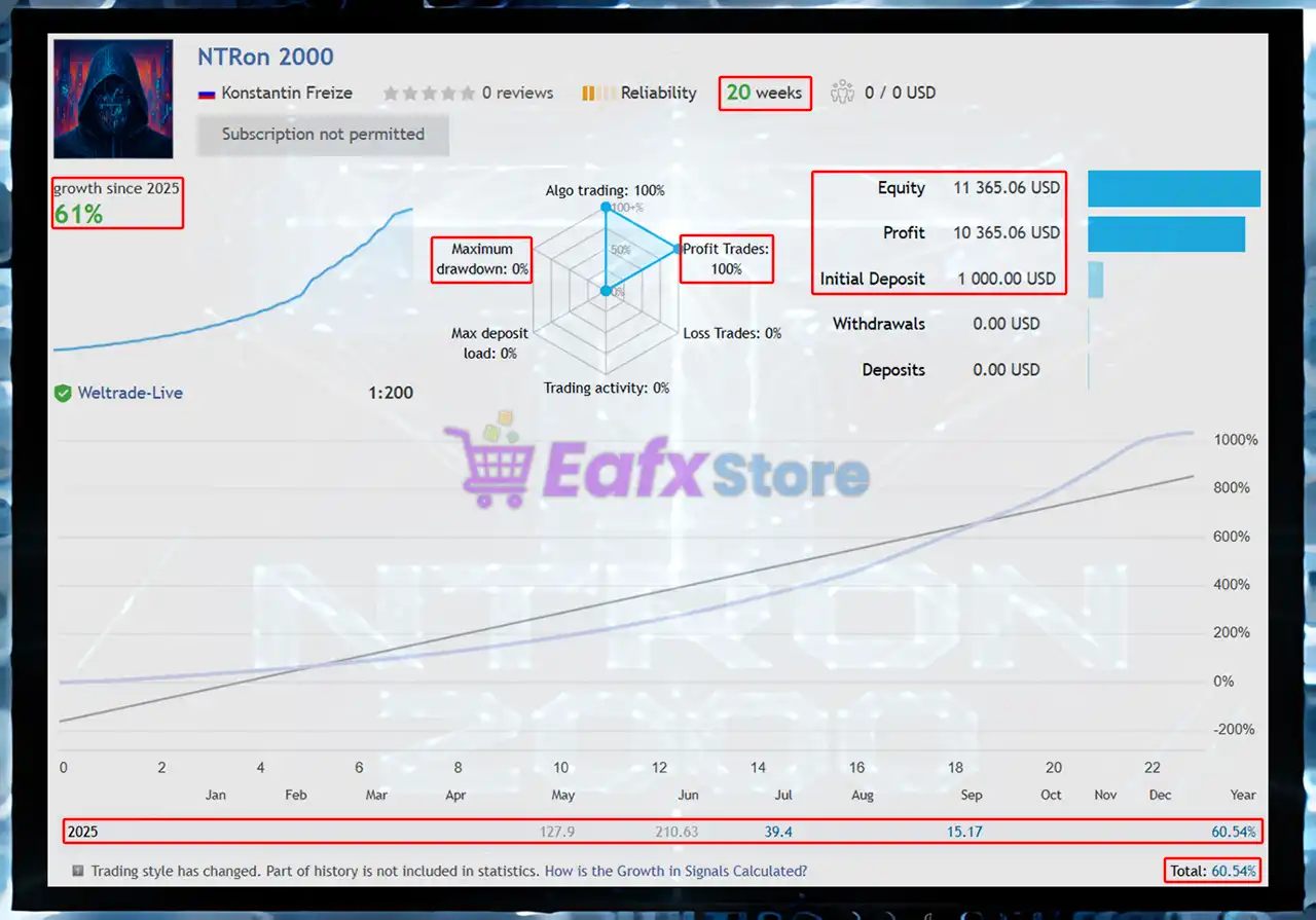 In 20 weeks of live trading, it achieved +60.54% growth, with a 100% win rate and 0% drawdown.