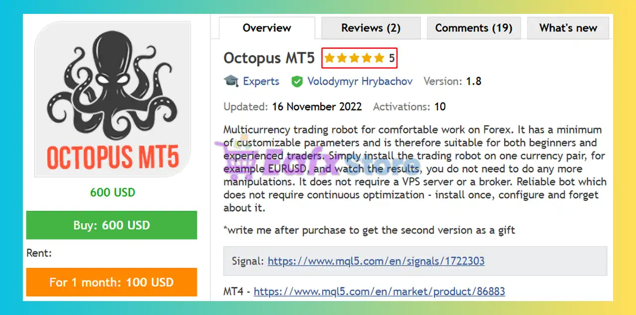 This product is compiled by Volodymyr Hrybachov. This author has more than +11 years of experience working on MQL5 with many famous products such as Octopus MT5, Hamster MT5, Kraken MT4, Universal MT5 and other advisors. Among them, Octopus MT5 is his best performing product.