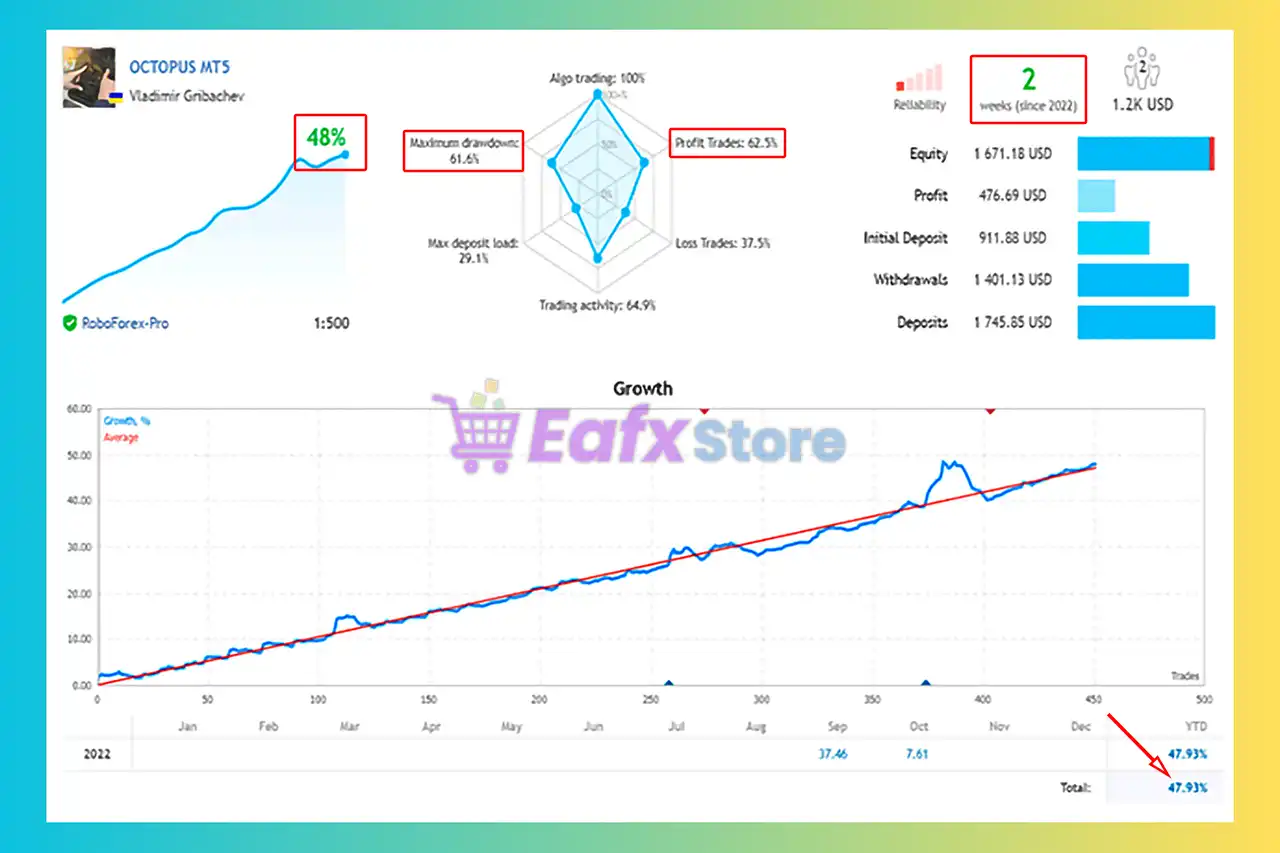 Octopus MT5 shows significant potential in providing stable and reliable profits, making it a reliable tool in the forex market. The advisor is highly appreciated by the MQL5 community in many aspects and has won the trust of users.