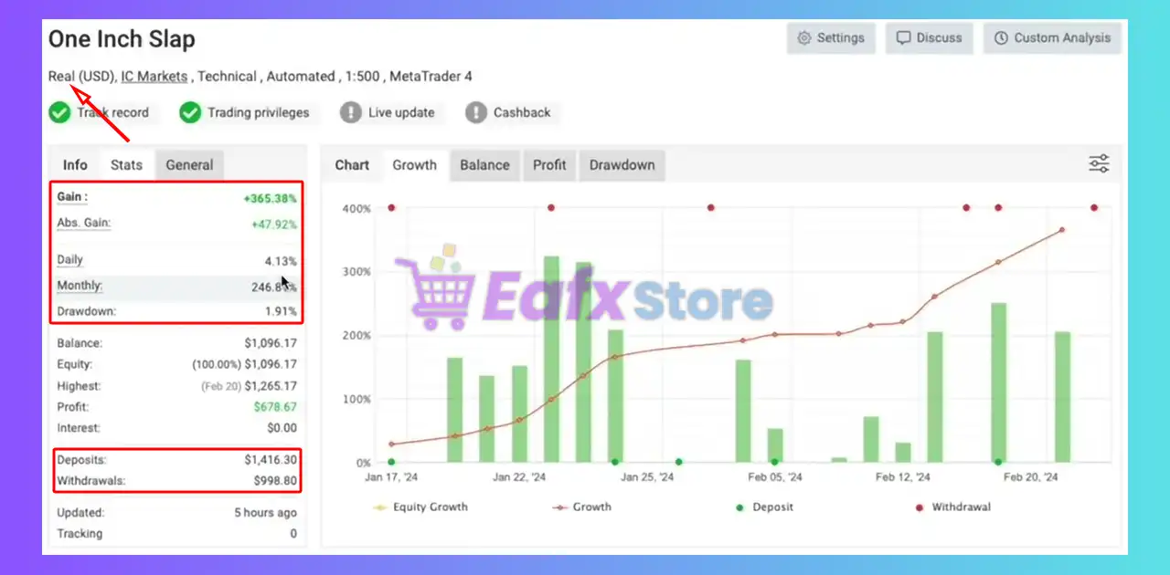 In short, One Inch Slap Auto EA is a reliable MT4 trading robot built for Gold traders seeking safe and automated performance. With no Martingale, Grid, or HFT, it ensures intelligent risk control while delivering impressive verified profits. Its M5 XAUUSD strategy, news filter, and simple setup make it ideal for beginners and professionals alike.