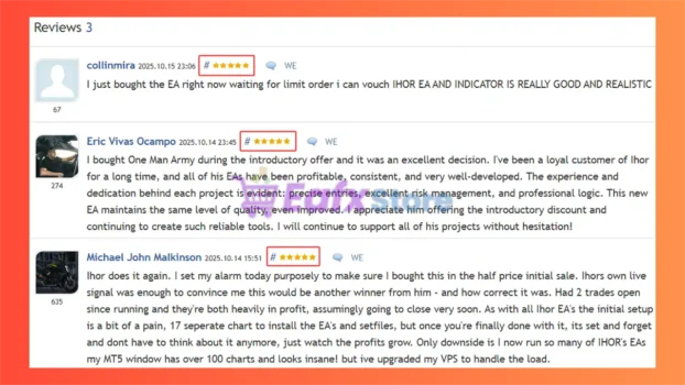 ➡️ Eric Vivas (2025.10.14): “I bought One Man Army during the introductory offer and it was an excellent decision. I’ve been a loyal customer of Ihor for a long time, and all of his EAs have been profitable, consistent, and very well-developed.”