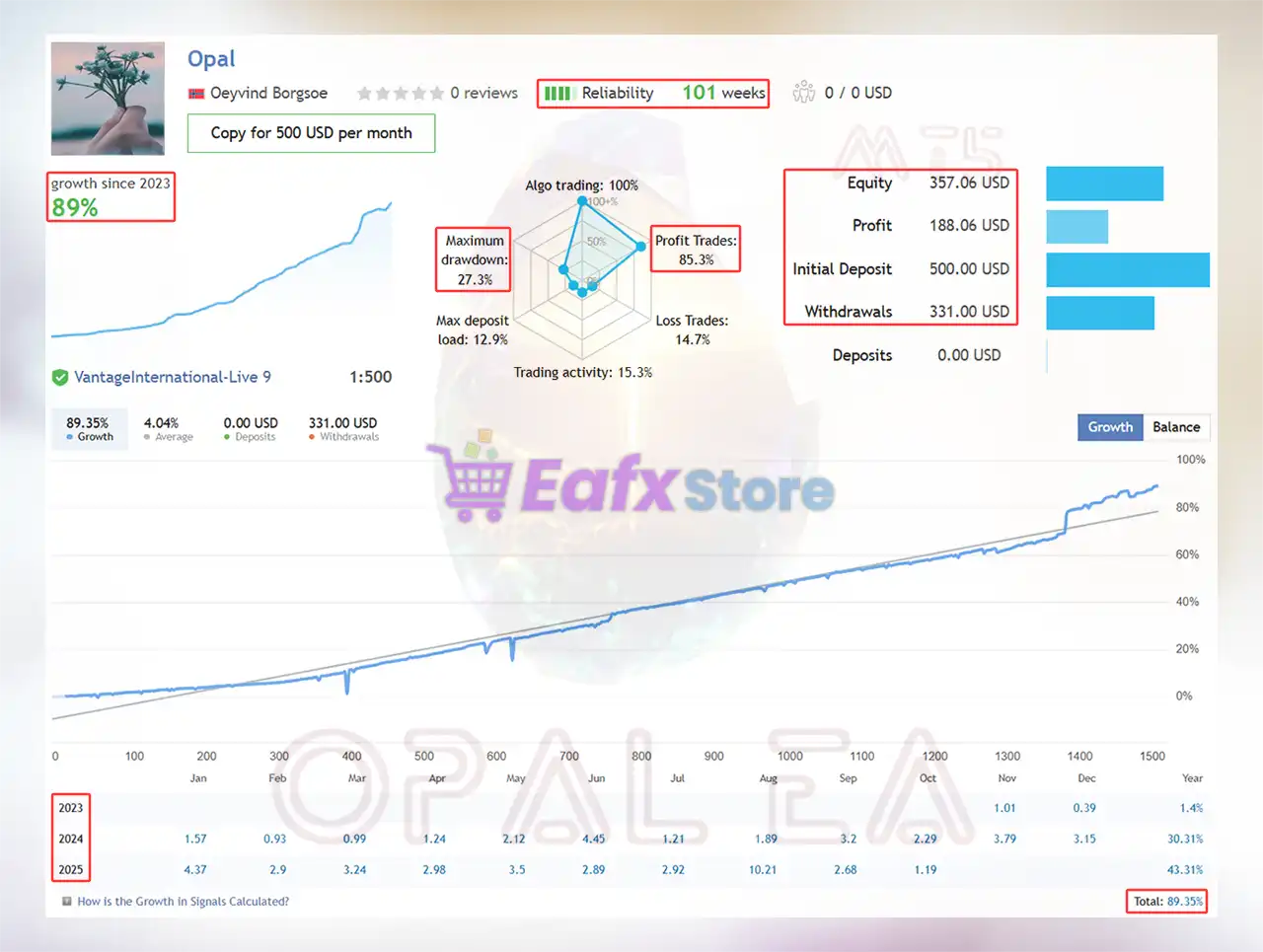Opal EA has been running on a live, verified trading account and trading privileges, showing consistent profits and controlled risks since 2023. This Expert Advisor combines algorithmic accuracy with low drawdowns, making it a strong choice for traders looking for sustainable profits.
