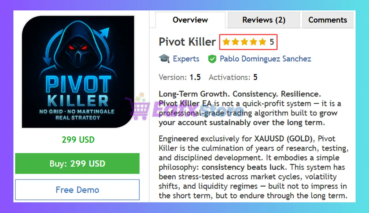 Pivot Killer EA is a professional MT5 trading system built exclusively for XAUUSD on the H1 timeframe. Unlike many Gold robots, it avoids Grid, Martingale, and Averaging, focusing instead on adaptive volatility pivot and breakout detection for long-term consistency and prop-firm safety.