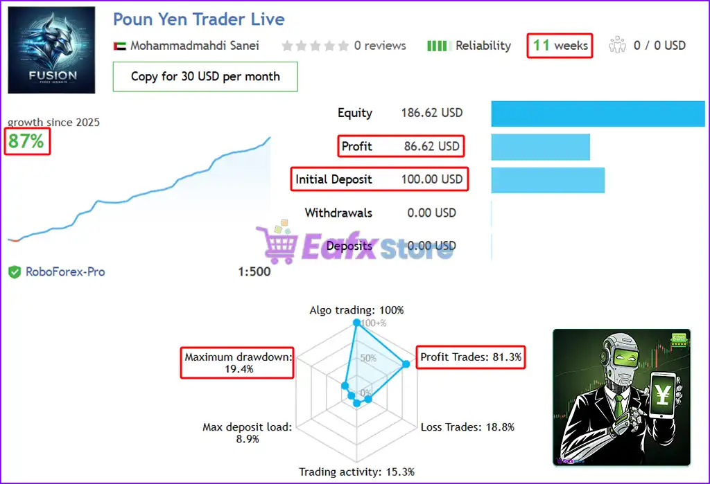 The Pound Yen Trader EA achieved impressive profit performance when trading with GBPJPY pair. Trading results on real account for 11 consecutive weeks of trading: