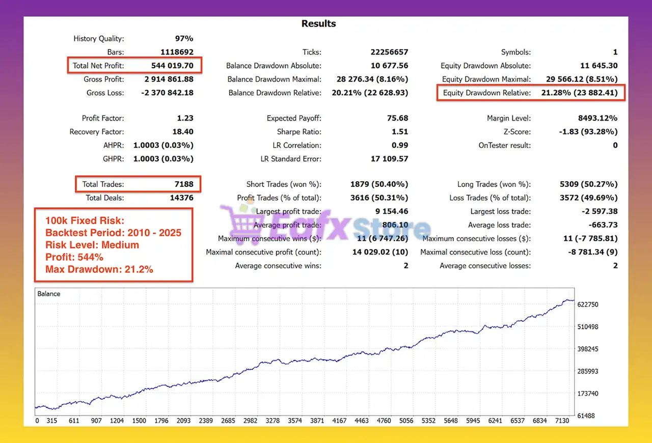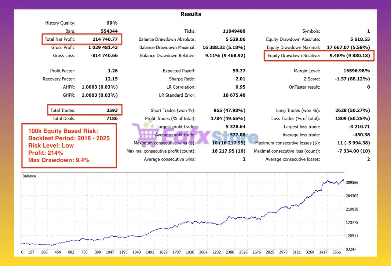 Backtests over 15 years show consistent profitability with strong drawdown control (as low as 2.9% in real trading). It has demonstrated up to +20% growth in just one week under live trading conditions.