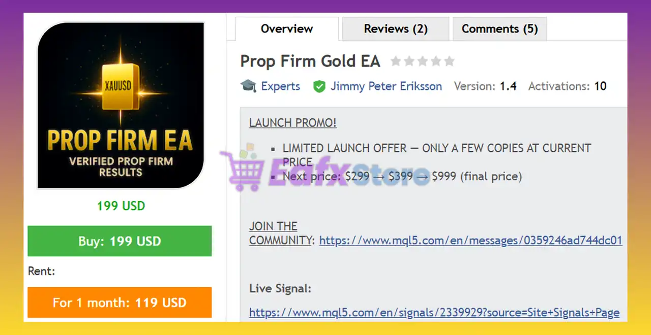 This product is compiled by Jimmy Peter Eriksson. This author has more than +1 years of experience working on MQL5 with many famous products such as Prop Firm Gold EA, Range Breakout EA with Range Filters MT5, Box Reversal EA and other advisors. Among them, Prop Firm Gold EA is his best performing product.