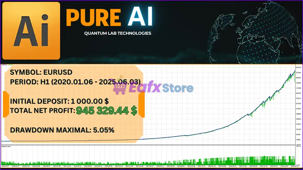 🔹Pure AI AI uses machine learning algorithms and low-risk trading logic when trading the EURUSD pair. This EA has proven its profitability and superior risk management over the past 5 years (January 2020 – June 2025).