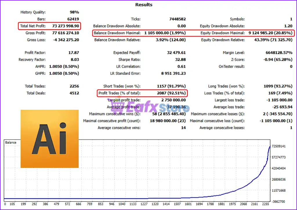 Backtest (2020–2025): $73M profit from a $1,000 deposit, with a 92.51% win rate and only 1.99% max balance drawdown.