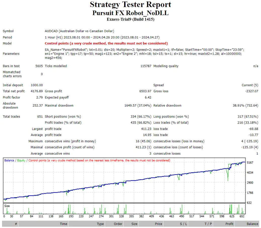 In backtests with a $1,000 starting capital, Pursuit FX Robot generated $4,200 profit in 8 months with a 37% maximum drawdown on AUDCAD (H1). This demonstrates a strong balance between profitability and controlled risk.