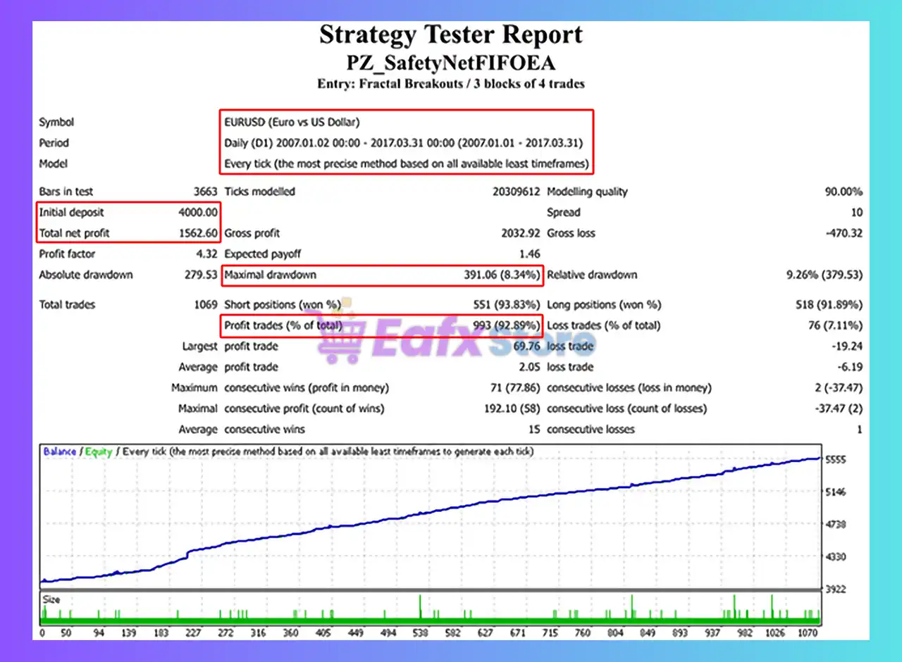 The PZ Averaging EA backtest trading results achieved impressive profit performance for 10 years on the EURUSD pair.
