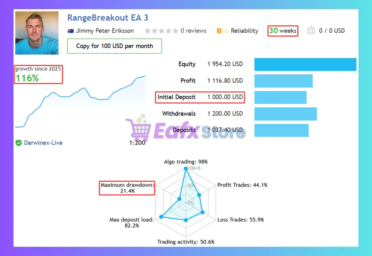 🧩 The Range Breakout EA has achieved impressive and safe profit performance. Trading results on real account for 30 consecutive weeks: