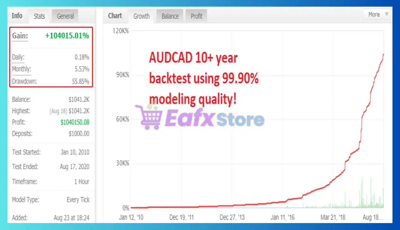 🔶 The Ranger EA has been verified by MyFxBook in the long term and has achieved impressive returns. The advisor shows good AUDCAD trading potential and high profit rate.
