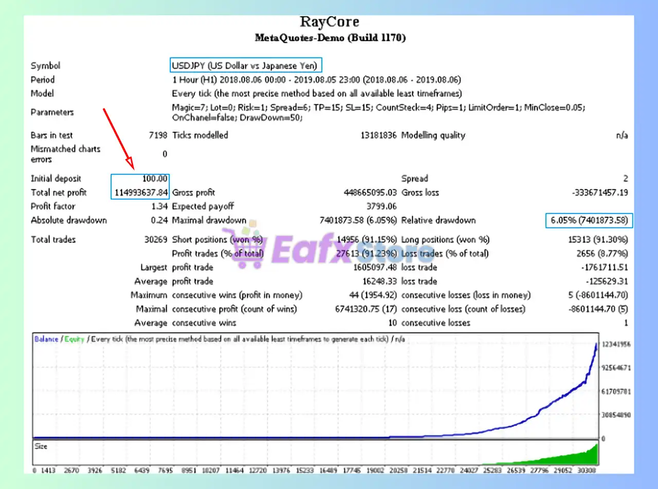 🔶 The RayCores EA backtest trading results achieved impressive profit performance for 12 months on the USDJPY pair.
