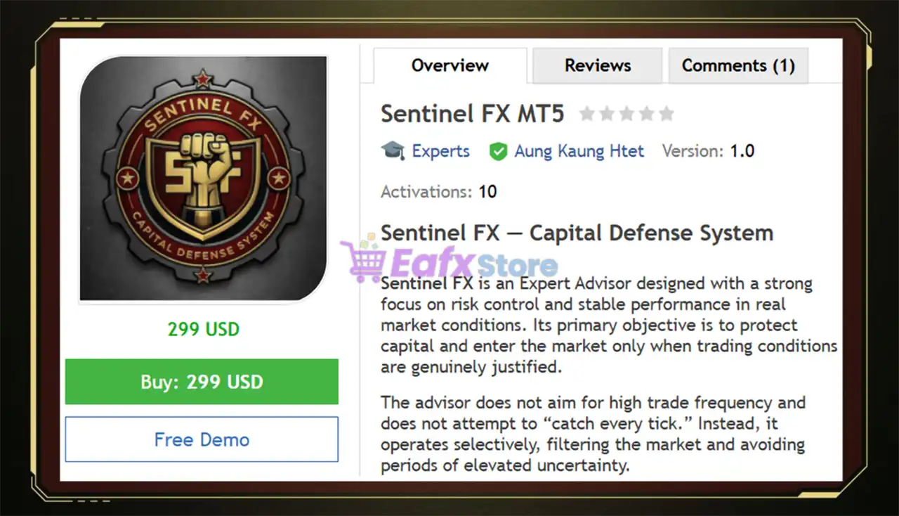 Sentinel FX MT5 was developed by Aung Kaung Htet (Trrian), an experienced MQL5 algorithmic developer known for "stripped-down" and elegant trading architecture. His portfolio includes other successful systems like NemyX Core and AuriON AI System.