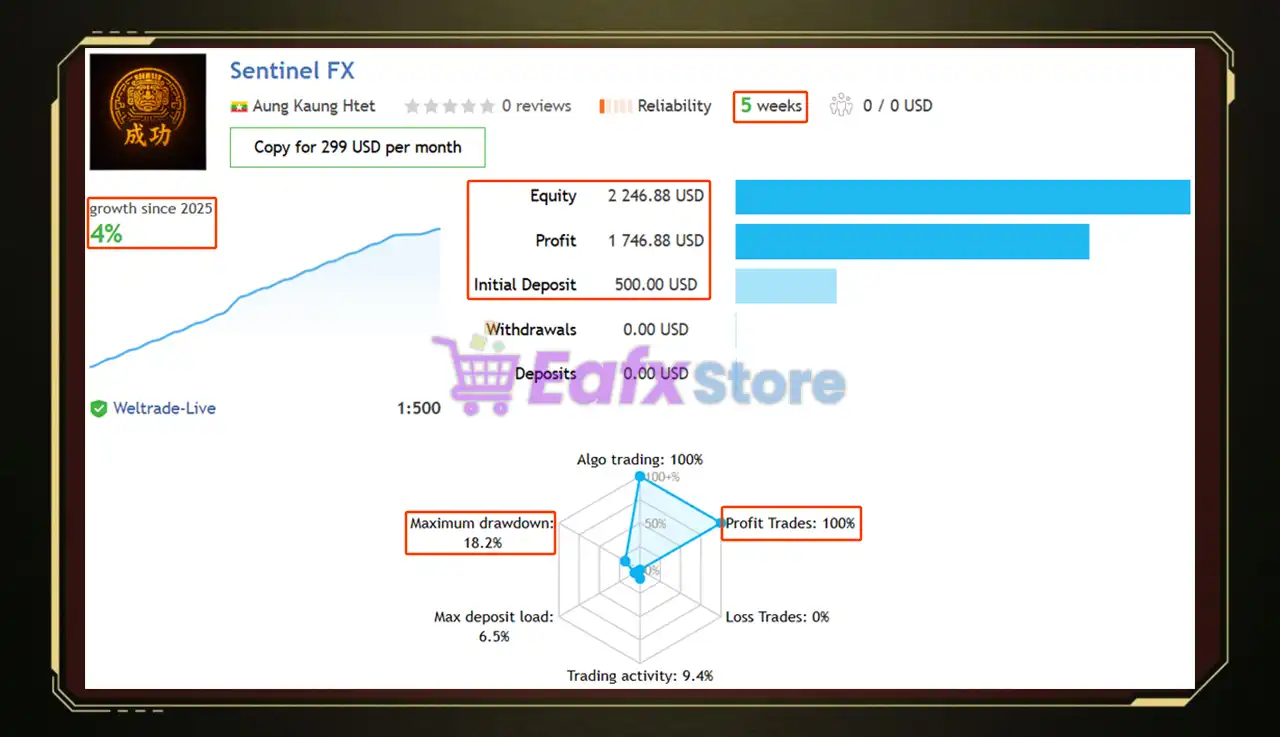 The Sentinel FX MT5 achieved impressive profit performance when trading with GOLD pair. Trading results on real account for 5 consecutive weeks of trading: