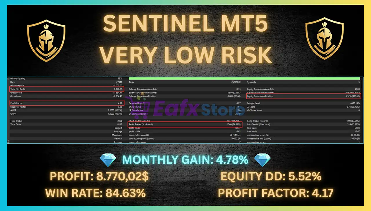 Sentinel MT5 has shown stable signal and backtest results with high win rate and low drawdown.