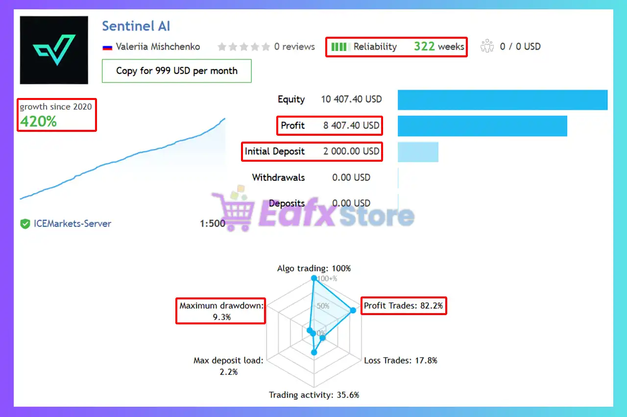 The Sentinel AI EA achieved impressive profit performance when trading with GBPUSD & EURUSD pairs. Trading results on real account for 322 consecutive weeks of trading.
